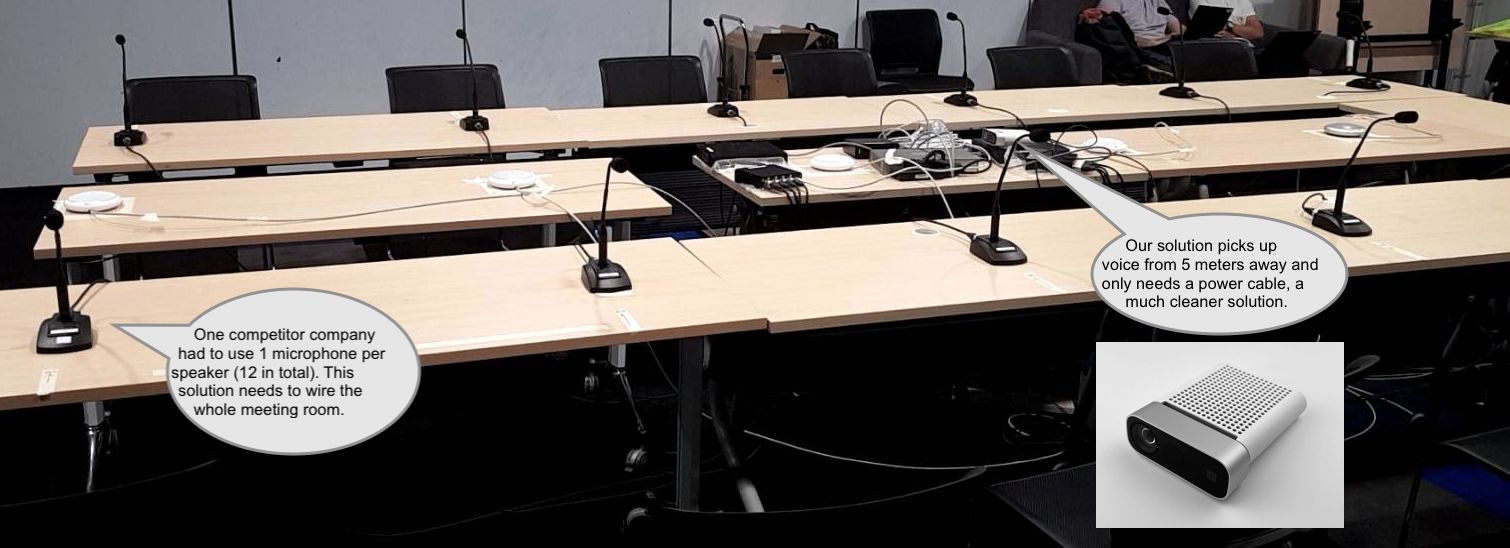 Sa ilang sukat, ang aming solusyon ay halos katulad ng “Alexa For Business”: isang aparato ang sumasaklaw sa buong silid, na may isang power cable lamang na kinakailangan. Kung ikukumpara sa solusyon ng aming mga kakumpitensya, ang aming solusyon ay mga henerasyon na nauuna sa diwa na tunay naming nauunawaan ang mga pangangailangan ng mga modernong negosyo habang sila ay ganap pa ring nakatali sa lipas na sa panahong wired na henerasyon.