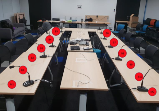 Pag-setup ng silid ng kumperensya ng PoC. Mayroong 12 nagsasalita na nagsi-simulate ng isang 2-oras na pagpupulong ng gobyerno.