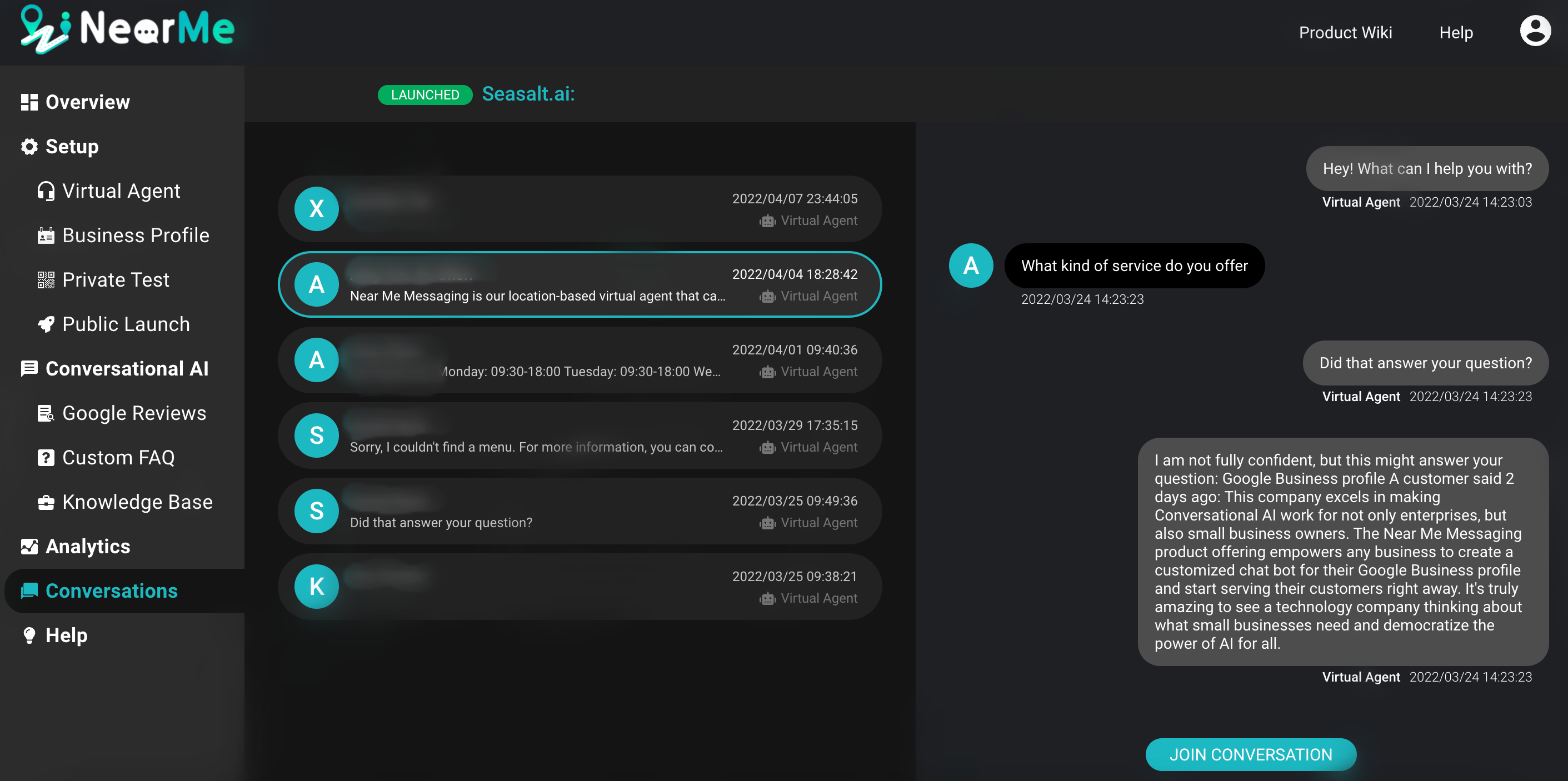 अपने एजेंट को अनुकूलित करने के बाद, आपके पास प्रदर्शन से संतुष्ट होने तक इसे निजी तौर पर परीक्षण करने की क्षमता होती है। जब आप तैयार हों, तो आप इसे सीधे Near Me Messaging वेबसाइट से सार्वजनिक रूप से लॉन्च कर सकते हैं। एक बार जब आप अपने वर्चुअल एजेंट को सार्वजनिक रूप से लॉन्च कर देते हैं, तो आपके पास अपने वर्चुअल एजेंट को लगातार बेहतर बनाने की क्षमता होती है जैसे कि अधिक FAQ जोड़ना और स्वागत संदेश बदलना। हर बार जब आप अपने वर्चुअल एजेंट को बेहतर बनाते हैं, तो आपके पास परिवर्तनों का परीक्षण करने और फिर एजेंट को फिर से लॉन्च करने का अवसर होता है। जब आप एजेंट को फिर से लॉन्च करते हैं, तो आपके द्वारा किए गए परिवर्तन उपयोगकर्ताओं को तुरंत दिखाई देंगे। व्यवसाय के मालिकों के रूप में, आपके पास वास्तव में हमारी टीम के साथ अतिरिक्त लागत या संचार समय के बिना अपने वर्चुअल एजेंट को बनाने और बेहतर बनाने की स्वतंत्रता और शक्ति है।