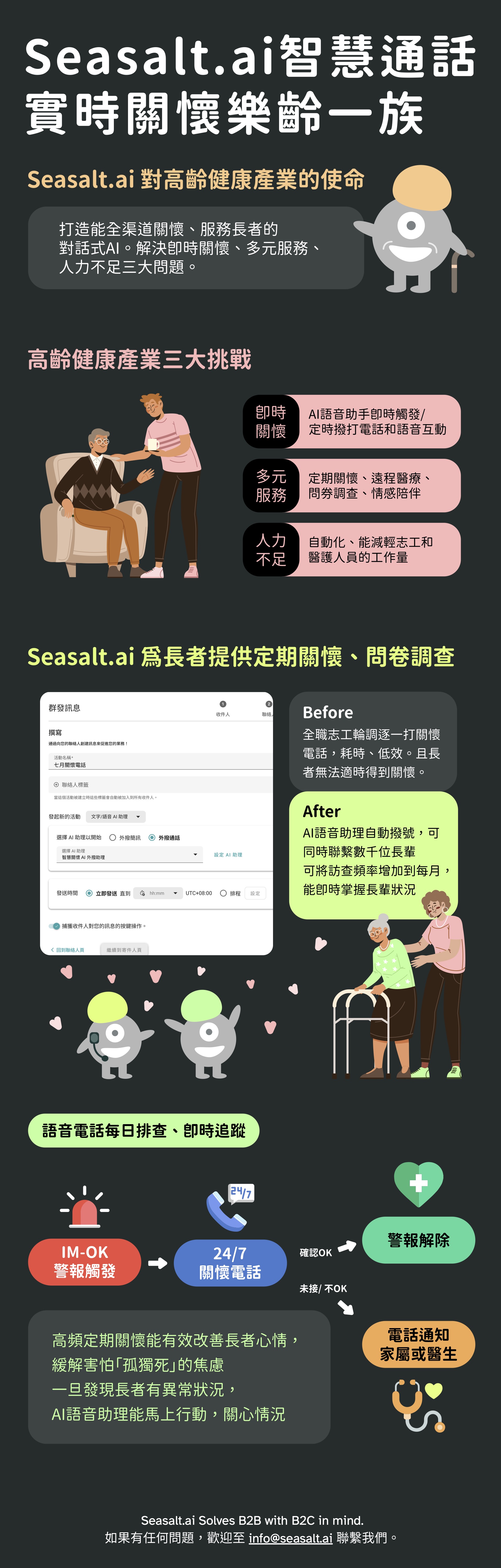 बढ़ती उम्रदराज आबादी के सामने, दुनिया भर में बुजुर्गों की देखभाल करने वाले संगठन कई चुनौतियों का सामना कर रहे हैं। विशेष रूप से नियमित देखभाल और स्वास्थ्य निगरानी के संबंध में, इसमें न केवल बड़ी मात्रा में मानव संसाधनों की आवश्यकता होती है, बल्कि लापरवाही या देरी के कारण संभावित समस्याओं का समय पर पता नहीं चल पाता है। यह एक चुनौती थी जिसका सामना Seasalt.ai के साथ सहयोग करने वाले सिंगापुर के एक सामाजिक सेवा संगठन को पहले करना पड़ा था। संगठन हर साल हजारों बुजुर्गों के साथ एक वार्षिक देखभाल फोन कॉल करता था, एक ऐसी प्रक्रिया जो बोझिल और कुशलता से प्रबंधित करना मुश्किल थी। इस समस्या को हल करने के लिए, उन्होंने SeaX को पेश किया, जिसने AI तकनीक के माध्यम से देखभाल सेवाओं की गुणवत्ता और दक्षता में काफी सुधार किया।